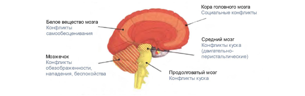 Фаза исцеления: Рост тканей мозга, отеки. С точки зрения ГНМ опухоль мозга не является самостоятельным заболеванием, а указывает на то, что в затронутом опухолью ареале происходит СБП, связанная с другим органом.