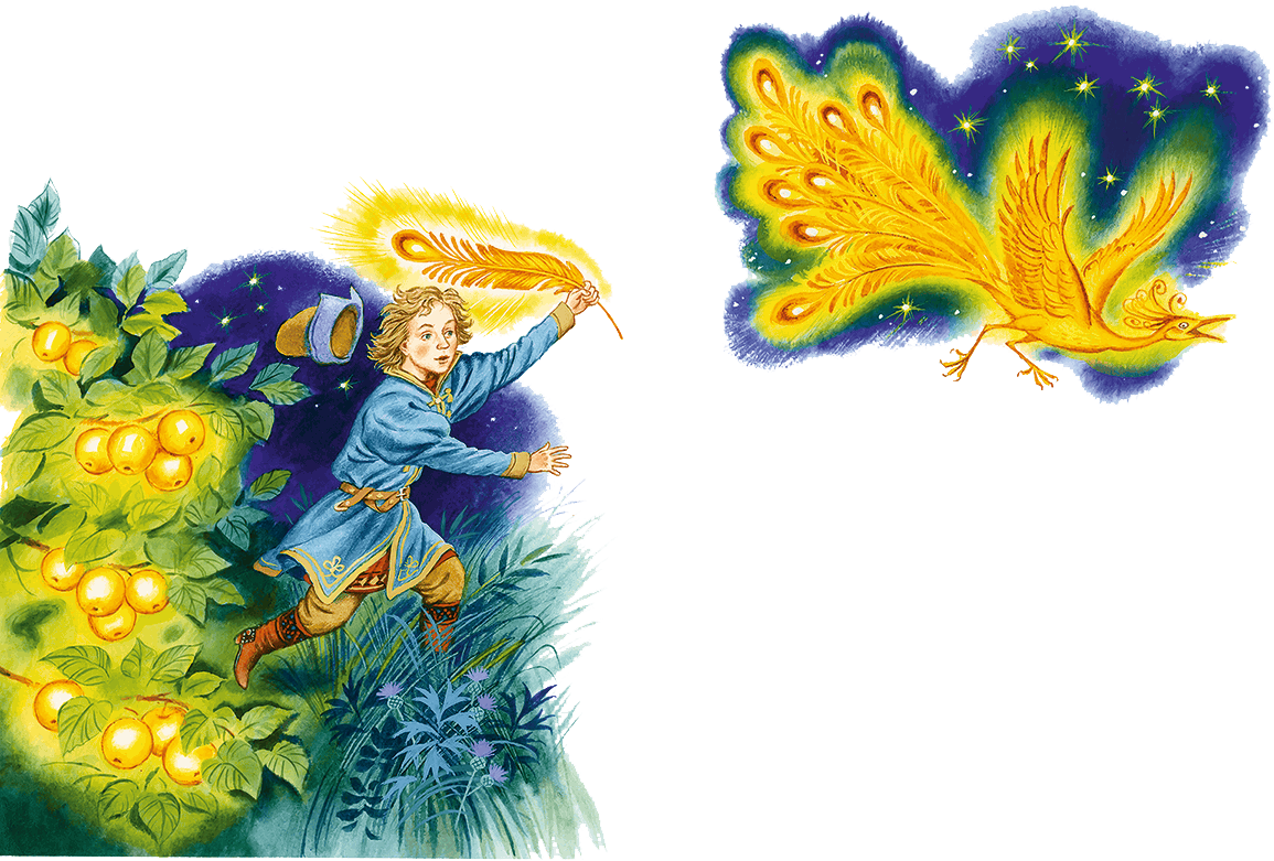 Половина ночи прошла, ему и чудится: в саду свет. Светлее и светлее. Весь сад осветило. Он видит – на яблоню села Жар-птица и клюёт золотые яблоки.